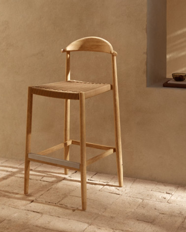 Barová stolička Nina s výškou sedenia 76 cm, vyrobená z prírodných materiálov a remeselných postupov. Rám je vyrobený z masívneho akáciového dreva so 4 vrstvami PU laku na ochranu pred UV žiarením. Sedák vyrobený z ručne tkaného a UV odolného lana. Drevo pochádza z udržateľne obhospodarovaných lesov, kde je ťažba kontrolovaná s cieľom chrániť životné prostredie. S kovovou podpierkou nôh. Dostupné v rôznych povrchových úpravách a/alebo farbách.