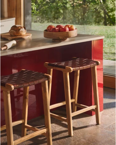 Sedenie stoličky Calixta, je vyrobené z hnedých ručne zapletaných kožených remienkov s ideálnym štýlom do každého kúta vášho domova, dokonca aj k vášmu americkému baru. Konštrukcia je vyrobená z masívneho teakového dreva, takže ide aj o dizajnový kúsok, ktorý vám dlho vydrží. Vďaka prírodným materiálom má každá stolička svoje vlastné tóny a textúry, vďaka čomu je každý kus exkluzívny a neopakovateľný.