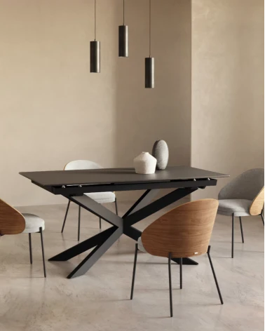 Tri materiály v jednej kolekcii? Výzva prijatá s neprekonateľným výsledkom. Eamy kombinuje jaseňovú drevenú dyhu, čalúnenie a kov v dokonalom dizajne na dodanie štýlu vašim večerným rozhovorom.