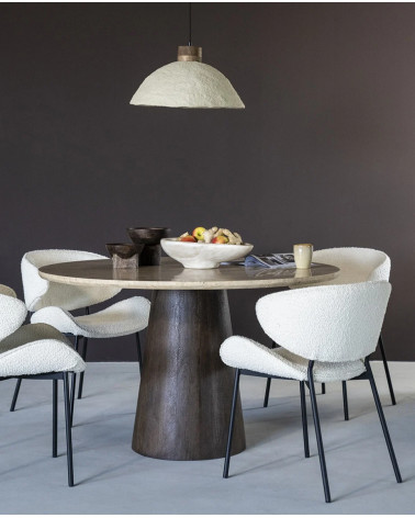 Objavte jedálenský stôl Aikin od Eleonory, vyhlásenie o nadčasovej sofistikovanosti. S okrúhlou travertínovou doskou v jemnom béžovom odtieni sa tento stôl pýši fascinujúcimi prírodnými zrnami. Lakovaný povrch dodáva šmrnc a chráni povrch. Vďaka kužeľovej podstavci je decentným dizajnovým stredobodom každého jedálenského kúta. Aikin v sebe spája štýl aj praktickosť, vďaka čomu je dokonalým doplnkom do každej domácnosti.