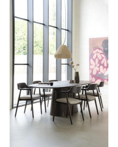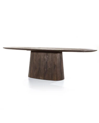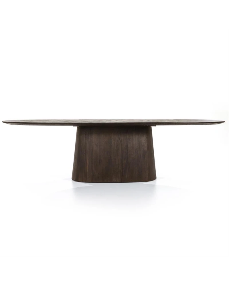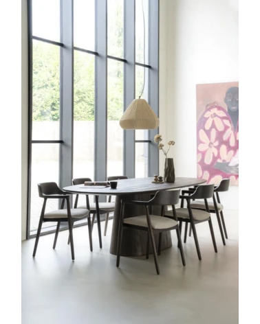 Jedálenský stôl Aron od Eleonory sa stane srdcom vášho domova a ponúka dokonalé prostredie pre nezabudnuteľné stretnutia a jedlá. Tento stôl vyrobený z mangového dreva v bohatom hnedom odtieni vyžaruje teplo a útulnosť. Jeho oválna stolová doska podopretá jednou centrálnou základňou vytvára intímnu a príjemnú atmosféru, ktorá je ideálna na spoločné jedlá a milé chvíle.