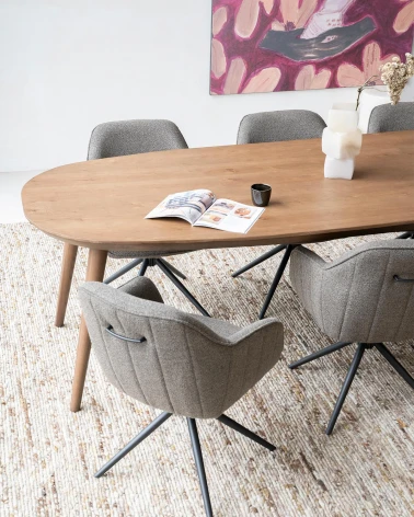 Pozdvihnite svoj kulinársky zážitok s jedálenským stolom Eleonora Elijah z lakovaného dubového dreva. Vďaka svojim veľkorysým rozmerom 220x100 cm ponúka tento stôl dostatok priestoru na útulné večere s rodinou a priateľmi. Oválna doska stola je vyrobená z vysoko kvalitného duba, ktorý nielenže dodáva prirodzený vzhľad, ale zaručuje aj odolnosť a stabilitu. Jeho elegantný dizajn a vynikajúce remeselné spracovanie z neho robia výrazný kus nábytku, ktorý dodá eleganciu každému jedálenskému priestoru.