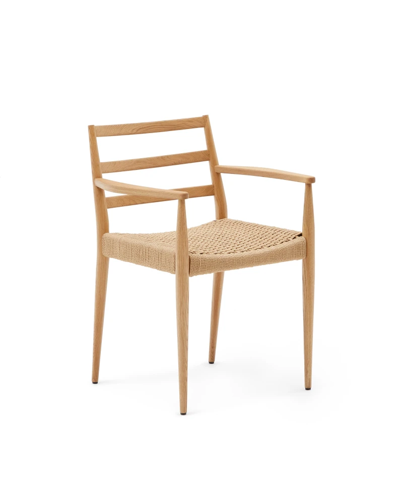 Stolička s podrúčkami z masívneho dubového dreva s prírodnou povrchovou úpravou. Masívna štruktúra dubového dreva v čiernom prevedení s jedinečnými odtieňmi a žilkami prechádzajúcimi každým kusom. Sedák vyrobený z ručne tkaného papierového lanka. Drevo s certifikáciou FSC™, pochádzajúce z trvalo udržateľných lesov a kontrolovanej ťažby dreva. Dostupné v iných povrchových úpravách a štýloch.
