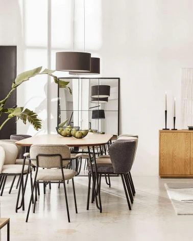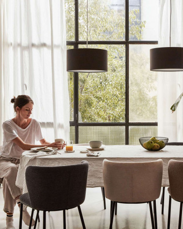 Stolička Ciselia čalúnená ženilkovou látkou. Kovová konštrukcia s matnou čiernou povrchovou úpravou. Dizajn Kave Cares: vnútorná štruktúra vyrobená z dreva s nulovými emisiami s nízkym obsahom formaldehydu pre čistejšiu planétu. Drevo s certifikátom FSC Mix Credit, vyrobené zo zmesi materiálov z lesov certifikovaných FSC a dreva kontrolovaného FSC. Dostupná v rôznych povrchových úpravách a farbách.