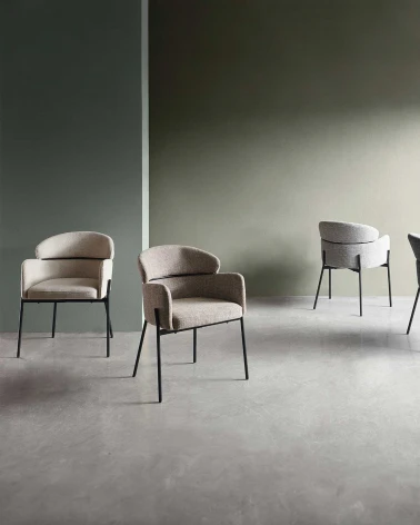 Tento model stoličky má dvojité operadlo a polstrované opierky na ruky, ktoré poskytujú pohodlie a oporu. Jej elegantný profil a čisté línie dopĺňa čalúnenie v svetlo hnedom odtieni, ktorý ponúka neutrálny a univerzálny vzhľad, ideálny na kombinovanie s rôznymi štýlmi interiéru.