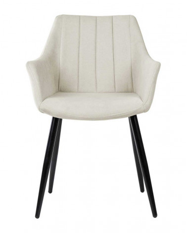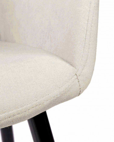 Stolička FIONA vyniká svojím súčasným dizajnom a vysokým komfortom. Jej zakrivené operadlo s vertikálnym prešívaním podčiarkuje moderný štýl. Sedadlo aj operadlo sú čalúnené a polstrované v béžovej látke, ktorá ponúka dokonalú kombináciu pohodlia a štýlu. Štíhle, šikmo postavené nohy v čiernej farbe vytvárajú pôsobivý kontrast so svetlým poťahom a zároveň zaisťujú optimálnu stabilitu.