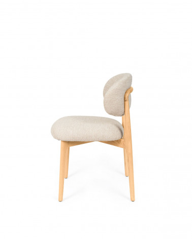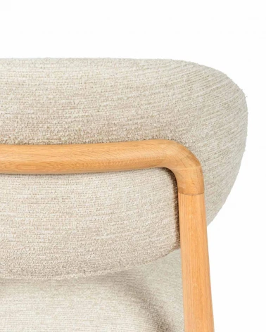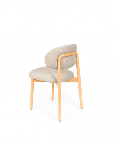 Operadlo a sedák, čalúnené jemnou látkou dostupnou v troch neutrálnych odtieňoch — béžovej, zelenej a svetlo hnedej, poskytujú maximálne pohodlie bez kompromisu v estetike. No práve zadná časť stoličky odhaľuje jedinečný detail: viditeľnú drevenú konštrukciu, ktorá elegantne rámuje operadlo svojím zakriveným, remeselne spracovaným tvarom, vďaka čomu sa WANDA stáva dekoratívnym prvkom aj pri pohľade zozadu.