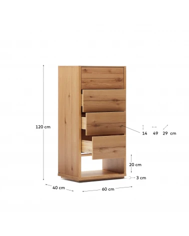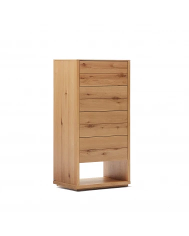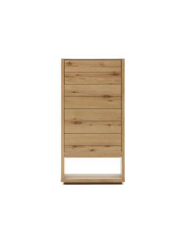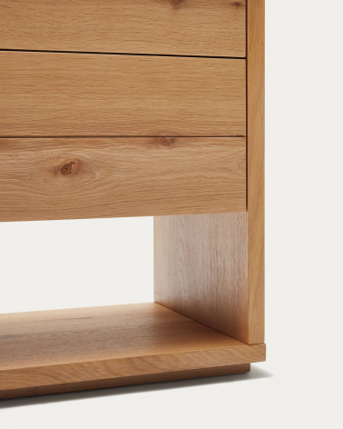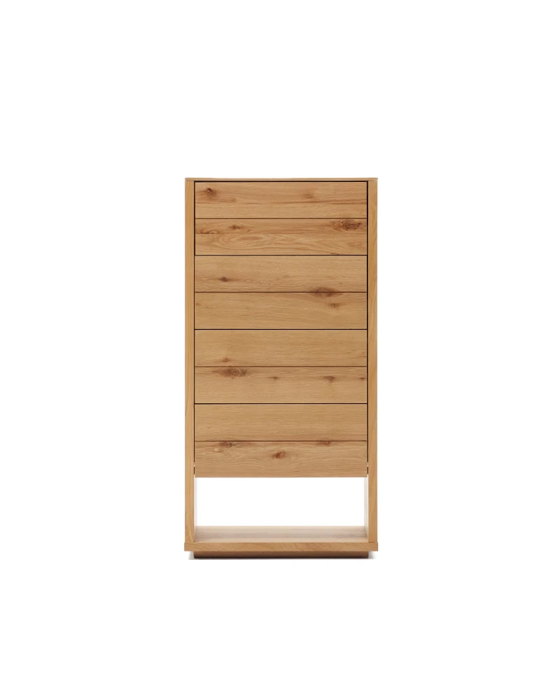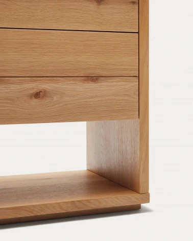 Komoda z dubovej drevenej dyhy s prírodným povrchom. 4 zásuvky so skrytými, nastaviteľnými výsuvmi a mechanizmom otvárania stlačením. Dodáva sa s nastaviteľnými nožičkami. Kave Cares Design: vyrobené z dreva E0 s nízkym obsahom formaldehydu, aby bola planéta čistejšia od škodlivých látok.