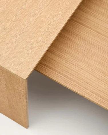 Konferenčný stolík z dubovej dyhy. Lak na vodnej báze, ľahko sa čistí mydlom a vodou, zvýrazňuje prirodzenú farbu dreva a dodáva mu hladkú textúru. Plstené podložky na nohách zabraňujú poškodeniu podlahy pri premiestňovaní. Vytvorte si zostavu stolíkov spárovaním s konferenčným stolíkom. Možno kombinovať so zvyškom kolekcie.