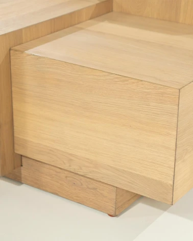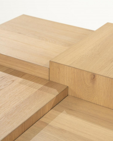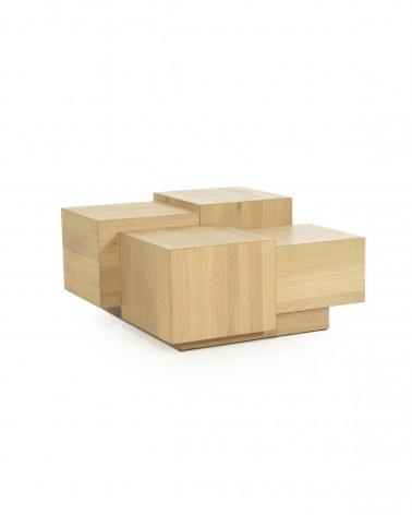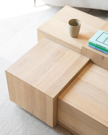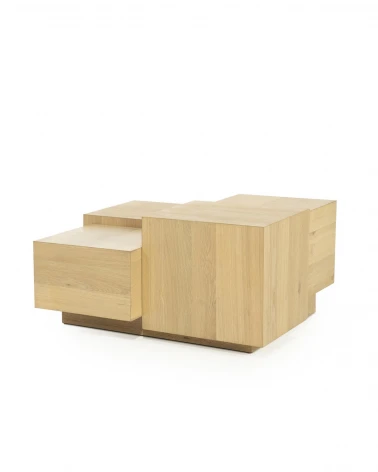 Tento veľký konferenčný stolík okamžite vynikne svojím výrazným, hranatým dizajnom, ktorý dodá vašej obývačke moderný nádych. Je ideálny na útulné stretnutia, na uloženie kníh a časopisov na dosah ruky alebo ako štýlové vystavenie vašich obľúbených bytových doplnkov. Vysokokvalitná dubová dyha vytvára teplý, prirodzený vzhľad, ktorý skrášli každý interiér.