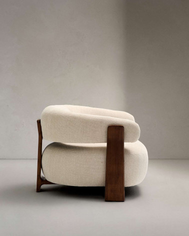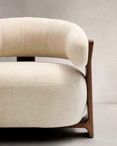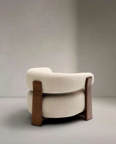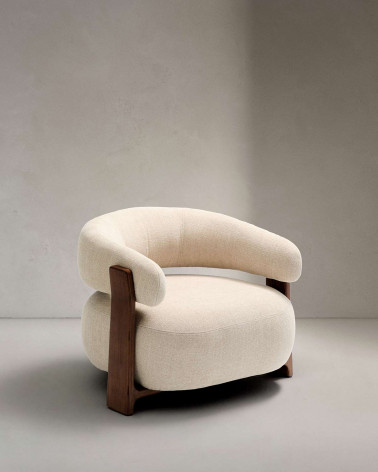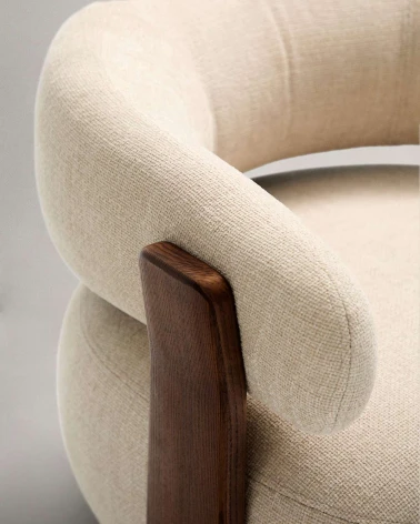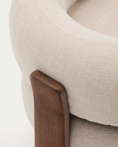 Kreslo čalúnené hrubou béžovou ženilkou s recyklovaným polyesterom a nohami z masívneho jaseňového dreva v prevedení orech.