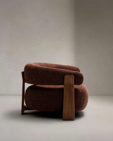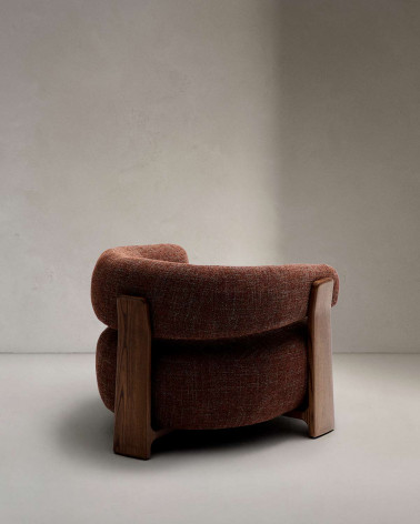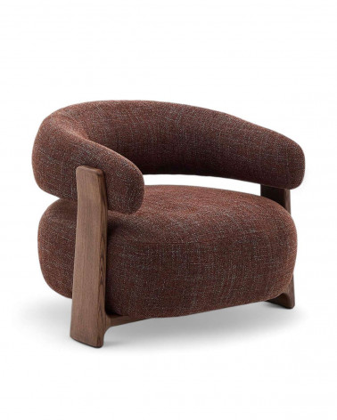 Kreslo čalúnené hrubou dvojfarebnou hnedou ženilkou s recyklovaným polyesterom a nohami z masívneho jaseňového dreva v prevedení orech.