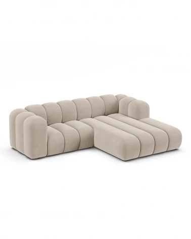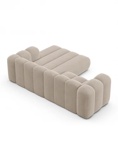 Trojmiestna zamatová modulárna pohovka Lupine v béžovom zamаtе ponúka pravostranné usporiadanie s maximálnou elegantnosťou. Luxusná látka Salvador 1 s jemným leskom a odolnosťou 100 000 cyklov je ideálna pre moderný domov.
