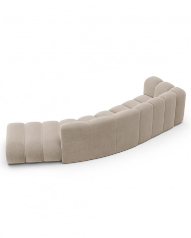 Päťmiestna zamatová modulárna pohovka Lupine v béžovom odtieni s pravostrannou orientáciou je symbolom luxusu a priestoru. S dĺžkou 335 cm ponúka dostatok miesta pre veľkú rodinu či hostí.