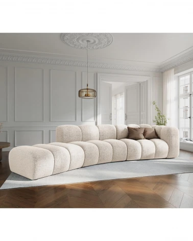 Päťmiestna modulárna pohovka Lupine v svetlobéžovej ženilke (Haga 23) s ľavostrannou orientáciou prináša do interiéru vzdušnosť a eleganciu. Aj napriek svojim veľkorysým rozmerom (335 cm) pôsobí vďaka svetlej farbe a nízkym nožičkám ľahko.