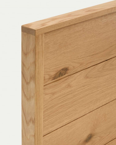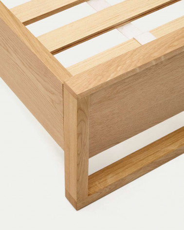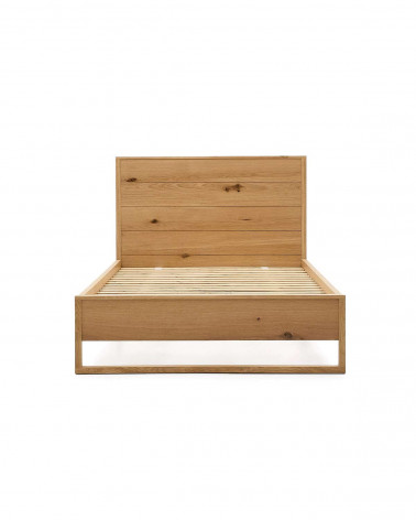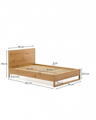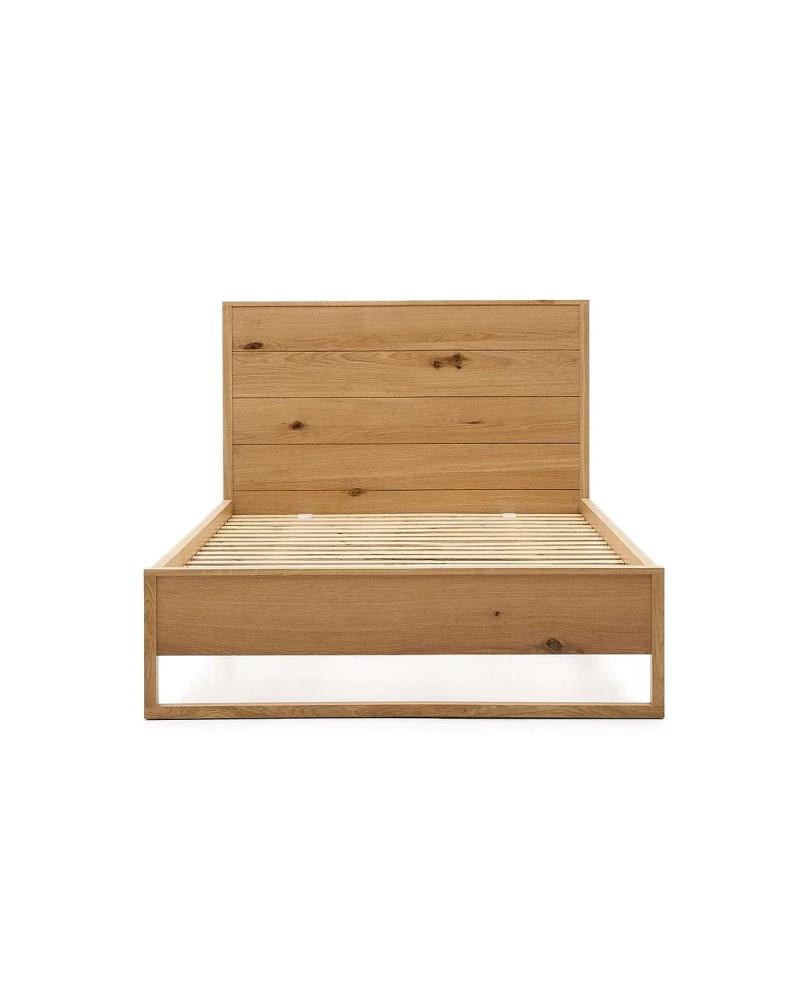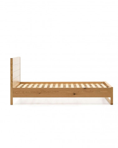 Tím Kave Home navrhol kolekciu Alguema, ktorá vďaka svojmu minimalistickému štýlu a povrchovej úprave z prírodného dubového dreva vzbudzuje pokoj a mier. Posteľ z dubovej dyhy s prírodnou úpravou pre matrac 90 x 190 cm. Čelo postele vyrobené z dubovej dyhy a masívneho dubového rámu. S preglejkovým roštom postele.