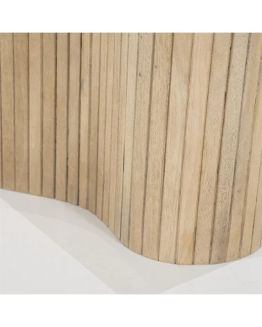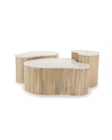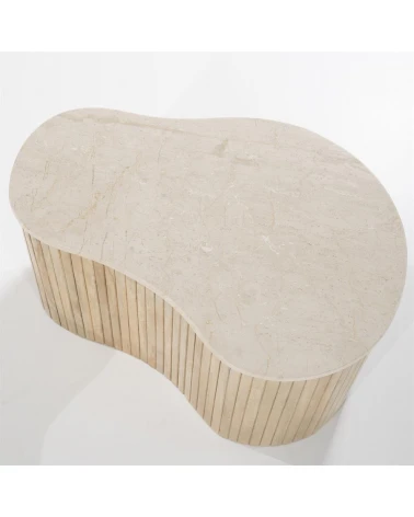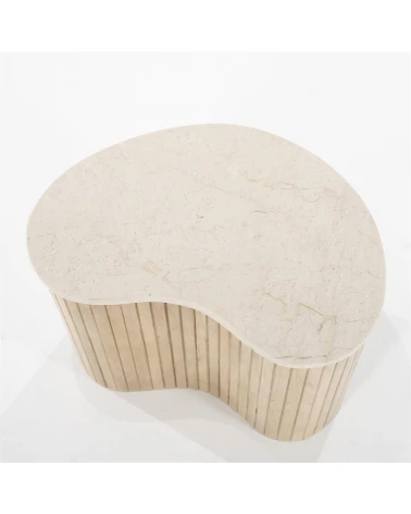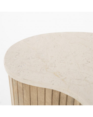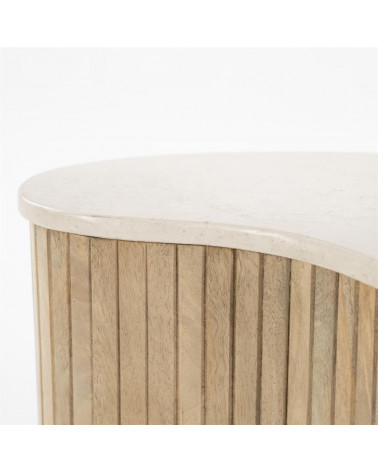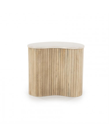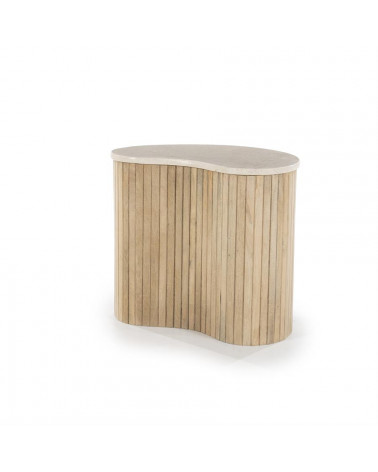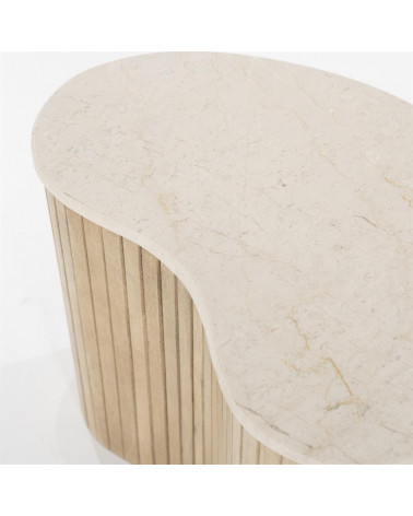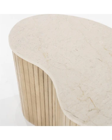 Dodajte svojej obývačke nádych sofistikovanosti s príručným stolíkom Kiry od Eleonory. Jeho jedinečný ryhovaný dizajn a bohaté mangové drevo z neho robia luxusný a exkluzívny kus nábytku. Vrchná doska z exkluzívneho mramoru. Pozdvihnite svoj interiér týmto elegantným a vkusným konferenčným stolíkom.