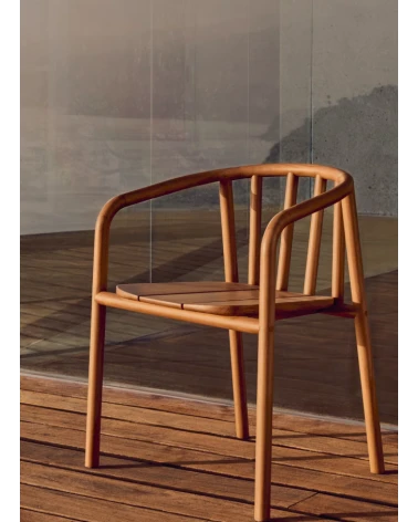 Stolička vyrobená z masívneho teakového dreva. Drevo s certifikáciou FSC 100% spotrebiteľského reťazca a pochádza z modelu zodpovedného lesného hospodárstva. Vhodné na vonkajšie použitie. Aby zostalo vždy dokonalé, aplikujte na drevo aspoň raz ročne prípravky na údržbu. Odnímateľné vankúše so sieťovanou penou, ktorá umožňuje vode prechádzať cez vankúš bez toho, aby sa zadržiavala vo vnútri, čo zaisťuje rýchlejší čas sušenia. Odporúča sa ich skladovať vo vlhkom počasí.
