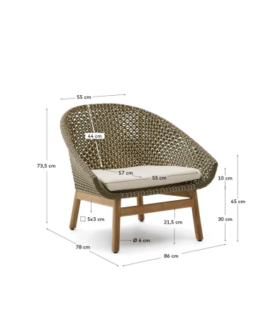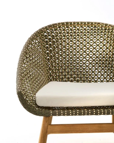 Každý detail konštrukcie Olbia odhaľuje rovnováhu medzi estetikou a funkčnosťou, čo z nej robí ideálny doplnok pre exteriérové priestory s osobnosťou. Jej sedadlo a operadlo, starostlivo ručne tkané z kvalitného syntetického ratanu, a UV-odolný lanový povraz zabezpečujú trvácnosť. Vankúše, navrhnuté s ohľadom na pohodlie a praktickosť, majú odnímateľné poťahy pre jednoduchú údržbu, a pena a poťah majú vodoodpudivé vlastnosti, ideálne pre chránené vonkajšie použitie. Aby sme ich uchovali, odporúčame aplikovať produkty na starostlivosť o teakové drevo dvakrát ročne.