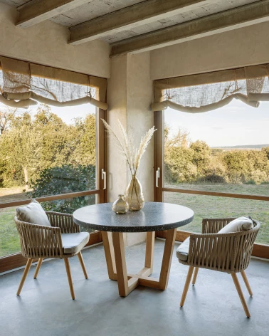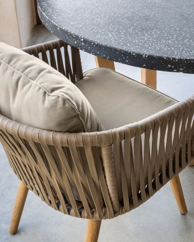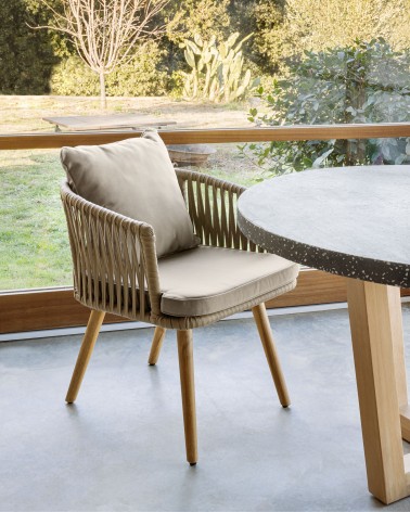Stolička s nohami z masívneho akáciového dreva. Drevo pochádza z udržateľne obhospodarovaných lesov s kontrolovanou ťažbou na ochranu životného prostredia. Rám vyrobený z hliníka odolného voči poveternostným vplyvom. Obsahuje vankúše so snímateľnými poťahmi, ktoré sú vodeodolné (v prípade dažďa) a možno ich prať v práčke. Vhodné do interiéru a krytých vonkajších priestorov.