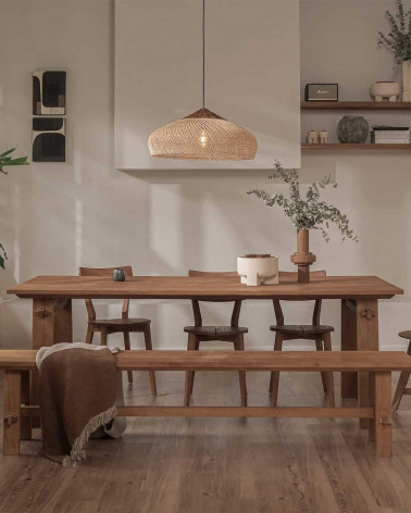 Táto lampa, kreatívna interpretácia klasického závesného osvetlenia, evokuje prvky prírody a remeselného spracovania. Má teakovú dosku a organicky tvarované ručne tkané ratanové detaily po stranách, všetko vyrobené tradičnou jávskou technikou. Zaveste ju samostatne alebo vytvorte zoskupenie závesných svietidiel kombináciou rôznych veľkostí a tvarov.
