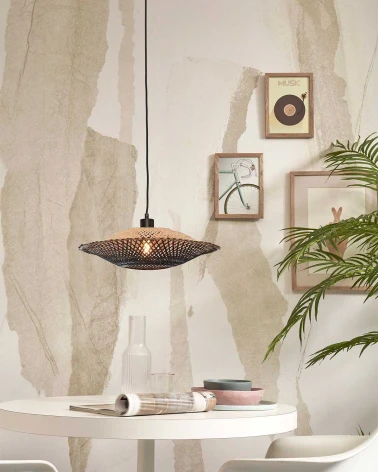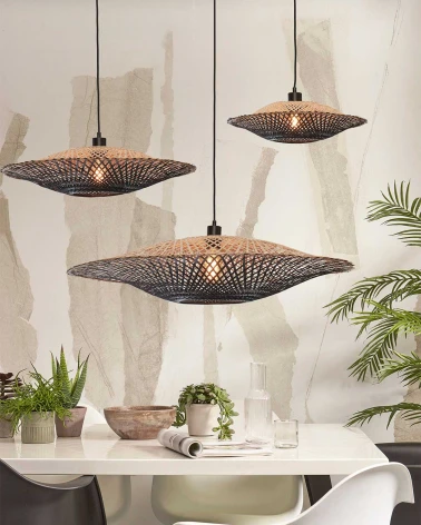 Závesná lampa Kalimantan zaujme na prvý pohľad svojím prírodným dizajnom a ručne tkaným bambusovým tienidlom. Kombinácia prírodnej a čiernej farby vytvára harmonický kontrast a zaujímavý svetelný efekt. Lampa je ľahká, ekologická a ideálna nad jedálenský stôl, do obývačky alebo spálne. Vďaka remeselnému spracovaniu každý kus pôsobí autenticky a originálne. Kalimantan je dokonalým spojením štýlu, udržateľnosti a atmosférického osvetlenia.