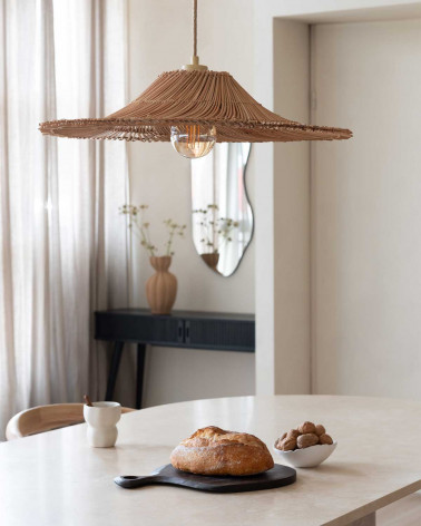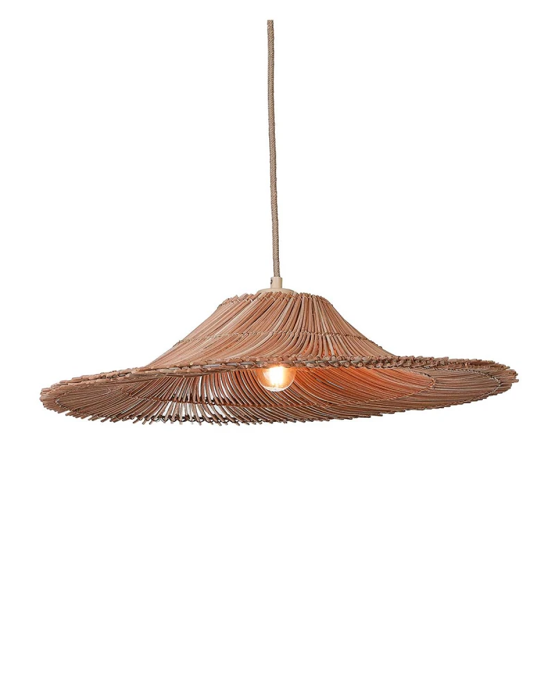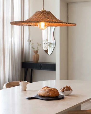 Závesná lampa Cancun z prírodného ratanu vyniká svojím tvarom a vzdušným výpletom. Jemne rozptyľuje svetlo a vytvára tropickú atmosféru, ideálnu do jedálne alebo nad barový pult.