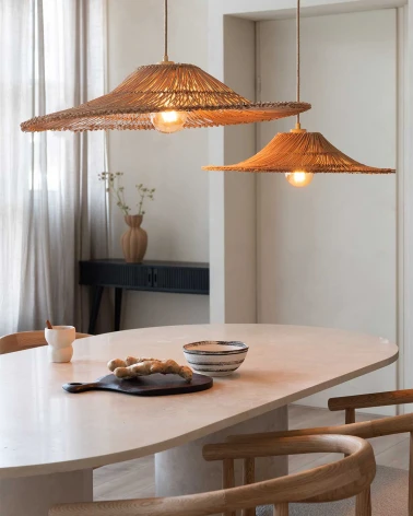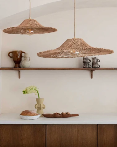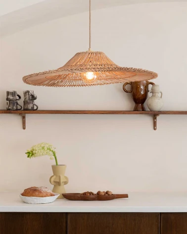 Závesná lampa Cancun z prírodného ratanu vyniká svojím tvarom a vzdušným výpletom. Jemne rozptyľuje svetlo a vytvára tropickú atmosféru, ideálnu do jedálne alebo nad barový pult.