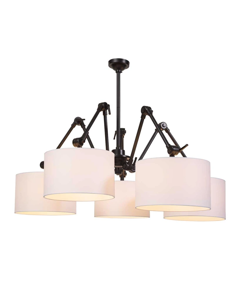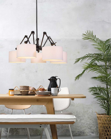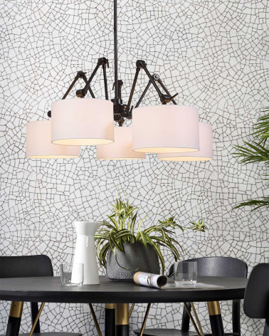 Závesná lampa Amsterdam je odvážna a dynamická interpretácia klasického lustra. Päť nastaviteľných ramien umožňuje meniť usporiadanie tienidiel podľa potreby a vytvárať tak rôzne svetelné kompozície. Kovový rám pôsobí industriálne a robustne, zatiaľ čo textilné tienidlá dodávajú jemnosť a vizuálnu rovnováhu. Tento model sa stane výrazným stredobodom miestnosti a prinesie charizmu aj praktické osvetlenie nad jedálenský stôl, do vstupnej haly alebo priestrannej obývačky.