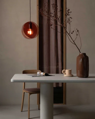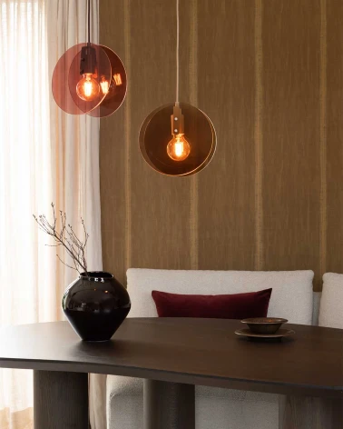 Závesná lampa Toledo od It’s About RoMi spája retro šarm s modernou eleganciou. Vrstvené sklenené tienidlo a kovové detaily vytvárajú teplé, rozptýlené svetlo a príjemnú atmosféru. Vynikne nad jedálenským stolom či v obývačke ako štýlový stredobod interiéru.
